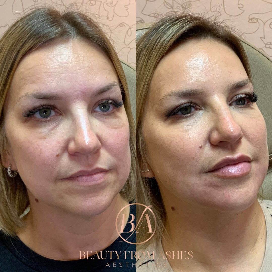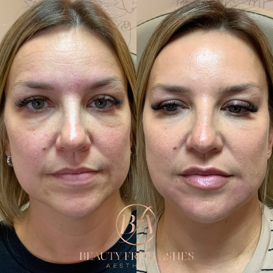 Dysport every 3 months, dissolved old under eye filler, 1 Sculptra treament, and multiple filler treatments. 1 year time lapse between Before and After images.